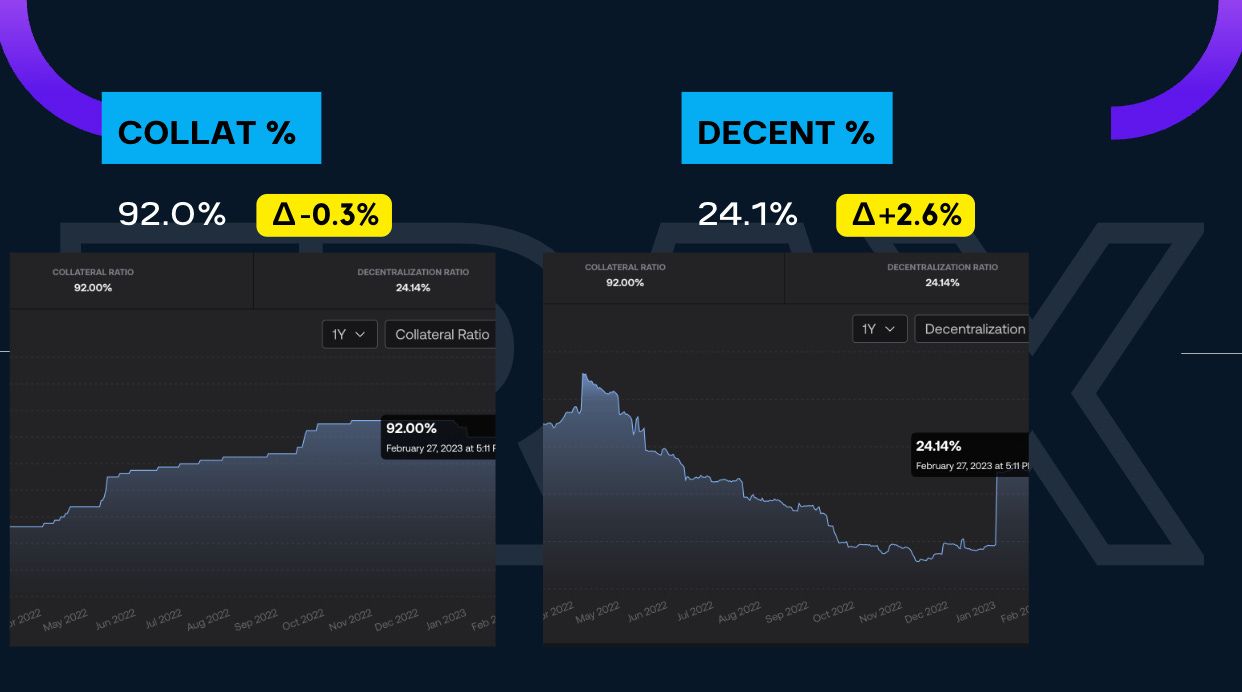 This is the % that conveys how much FXS (algorithmic) is used as collateral.  We decreased by 30 bps to 92%.  Following we have the Decentralize %, which saw an increase of 2.6% and are now sitting at 24.1%.
