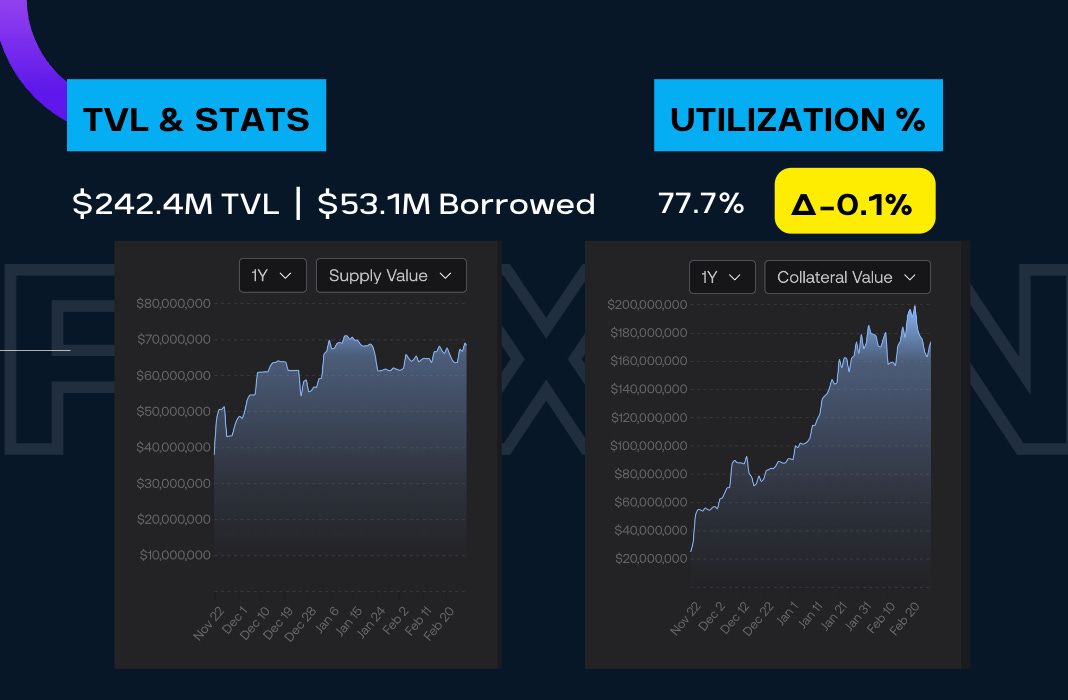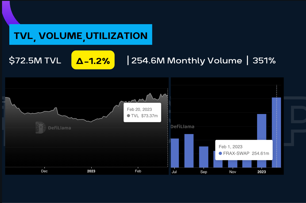 The last leg of the DeFi Trinity: the DEX aka FraxSwap.  Per DeFi Llama, the TVL is $72.5M with a 255M monthly volume for February.  I just took the Monthly volume divided by the TVL to get a utilization rate of 351%.  Granted the volume this past month has been picking up so if you look at December theutilization rate could be in the 70%s for the lows, but that’s still pretty good.  Now there is a slight discrepancy between DeFi Llama’s reported TVL and the one on Frax Facts but that’s because of the massive $85M FraxFPI pool that DeFi Llama isn’t including in the TVL.