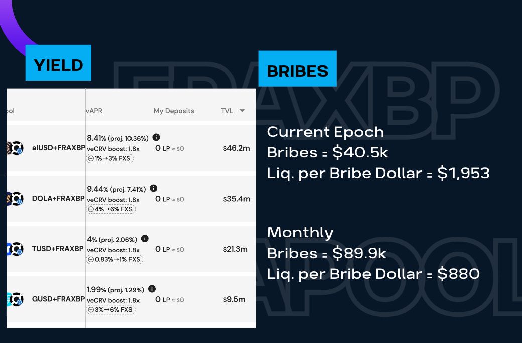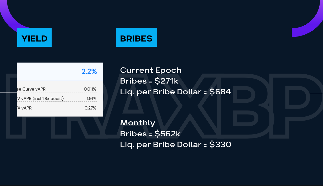 Following this slide, we have a yield and bribes section, where I look at the current yield being offered to LP into this pool and the bribes Frax Finance had to pay for the yield.  You see here that there’s an APR of 2.2% for a $530M pool so the estimated $450k of yield for the 14-day epoch because Votium epochs are 14 days.  Then we compare that to the bribes paid we see if there was any gain.  This epoch so far, we paid $271k so rough back of the envelope math says we’re doing pretty good so far this month.  However it’s important to note that Frax Finance’s POL isn’t the only liquidity in the pool so its reward shares are definitely diluted but that’s part of the plan as Frax wants to attract liquidity into the FraxBP.  To that end, $684 of liquidity were incentivized by $1 of bribes paid.  For this month so far Frax spent $562k in bribes and incentivized $330 per $1 of bribes spent.