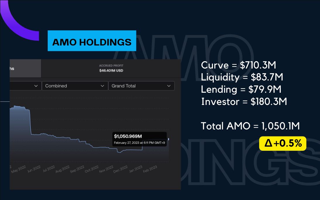 Finally, let’s jump into our profitability section starting an overview of the AMO holdings.  We have a grand total of $1050M across all the AMOs.  The Curve AMO is at 710M, Liquidity $83M, Lending $79.9M, and Investor 180M.