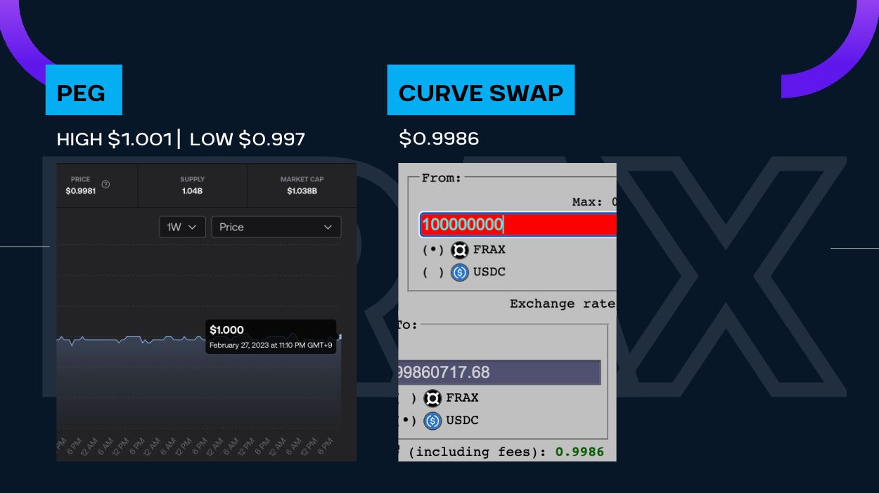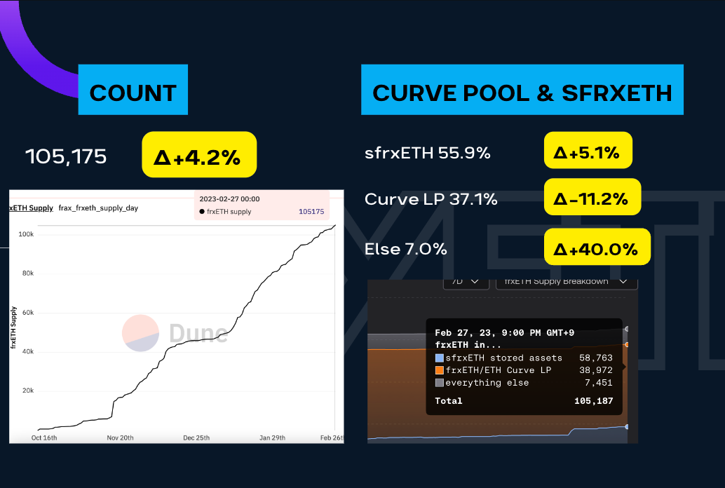 Next, we have our FrxETH segment.  We start by checking the frxETH supply.  As always, it’s up only!  The count is at 105,175.  And look at that chart, I know you can’t read it but just appreciate the verticalness off that graph.  +4.2%.  Hot.  I do think we may slow down in percentage growth terms as we’re getting to size but I hope we don’t!  Let’s look at where the frxETHs are hanging out! As a reminder, You can stake your frxETH into the sfrxETH vault to earn the native ETH staking yield.  And in that vault we see that 56% of the frxETH is chilling and stacking ETH earning a nice 7.4% APR.  The other place you can take your frxETH is to the curve pool of frxETH/ETH, where you can join 37% of the frxETH supply earning 7.7% APR in CVX, CRV, FXS.  The remainder 7% is floating in the ether somewhere.  I think the yield parity between the sfrxETH and Curve pool is reflected in the current split.  Unless Frax cranks up the bribes a bit more, I think we’ll see this heavier flow into sfrxETH.  And also lets note that there’s 7% of frxETH just chilling.  But enough talk of the supply and the yield, let’s get down to the peg.
