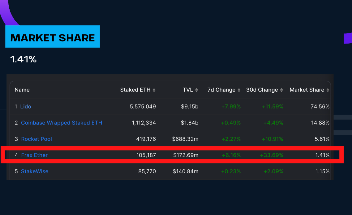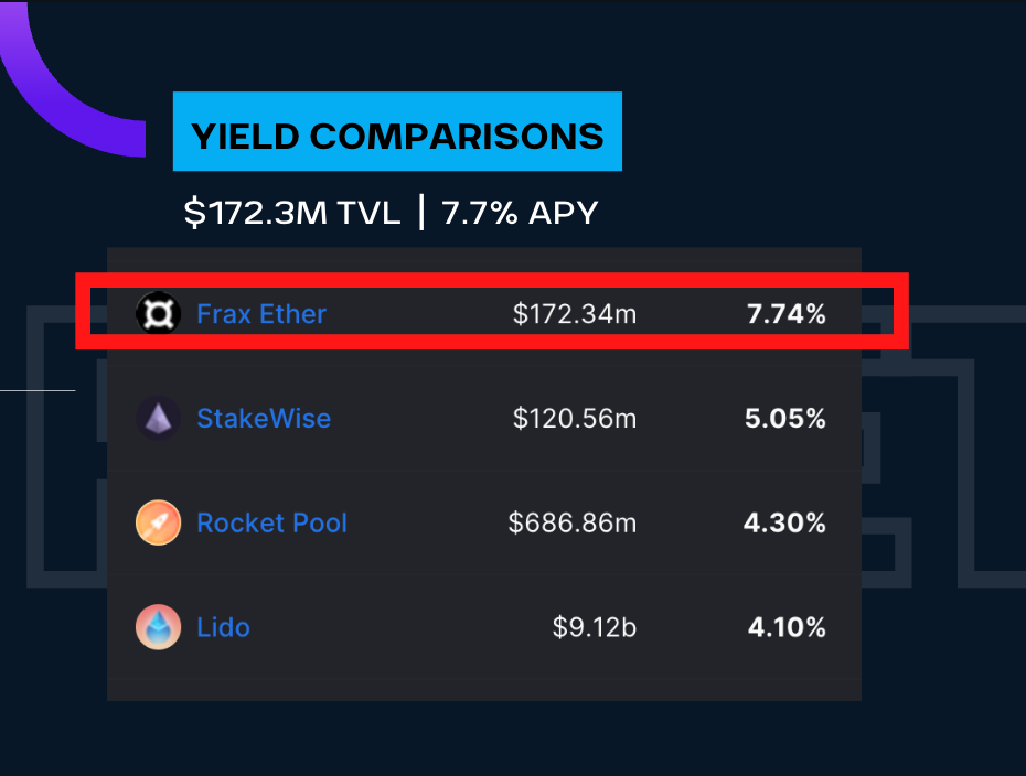 Here we layout the LSD market landscape.  Obvs, we have Lido in the lead with 74.5% of the market.  This week we saw a massive deposit from Justin Sun, adding 150k of ETH to Lido.  But you can see here that Frax REMAINED the highest 30-day delta in the group, at +33% so far.  FrxETH’s market share is at 1.41%.  Let’s keep fighting the good fight!  On the yield landscape, frxETH pretty much dominates with a 7.7% and the closest competitor is Stakewise at 5.0%.  We are the best game in town so come get some of this gud gud!