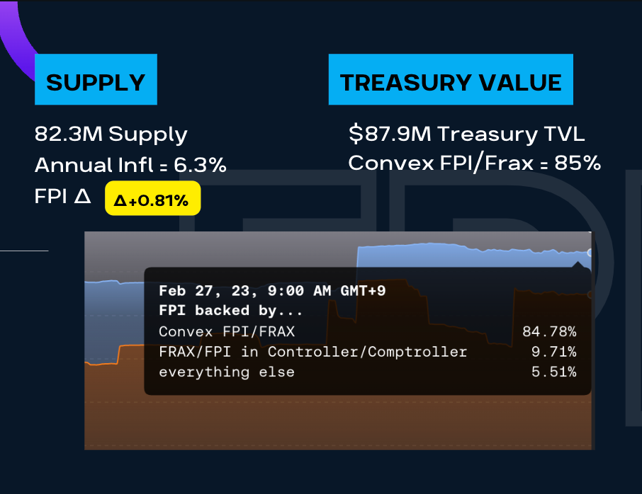 Next we have a new section I added.  Another one of Frax’s product that might not get as much as love as the other products is FPI.  Quick refresher, FPI is a Frax Price Index, which is a stablecoin that tracks inflation.  This is the first product of its kind on chain.  So lets run through the numbahs!  So far, we have 82.3M supply of FPI, current inflation reading (since Dec 2022) is 6.3% and the FPI peg is ABOVE by 0.81% of its peg.  And you’re wondering how it maintains its peg to inflation, well that’s what the treasury is for.  For the record, FPI’s treasury is at $87.9M.  Like how the AMOs work for Frax stablecoin’s treasury, the FPI’s treasury is made up of FPI, FRAX, and a small percentage holding of FXS.  As you can see 85% of the treasury is in the FPI/FRAX convex, with another 10% just consisting of FPI & FRAX chilling in the Controller/Comptroller smart contracts.  All these assets are put to work just like in the AMO to earn that needed yield to keep FPI at the inflation peg.