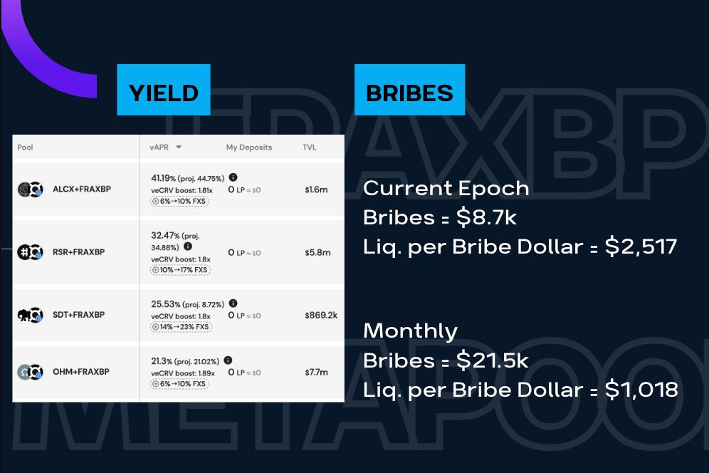 Reminder the metapool are pools that are PAIRED with the BasedPool, examples like LUSD/FraxBP.  We’re at $79M, a decrease of -1.4% from last week.  On the following slide, we’ll quickly cover some yields on these metapools as well as the bribes paid.  Because there are quite a few stablepair metapools, I’m only looking at the top ones by TVL.  The alUSD and FRAXBP pair is paying out 8% APR at nearly $46M in TVL, this gained about $40M TVL since I talked about it in like 3 Frax Checks ago.  I like that y’all are paying attention.  Honestly, still not too shabby if you believe/trust in alchemix’s mechanism and collateral set.  On the bribes front, Frax paid $40.5k this epoch.  And if we look at Liquidity per Bribe Dollar, Frax was able to pull in $1,953 per $1 of bribes spent.  For the whole month Frax spent $90k and got $880 of liquidity per $1 bribe dollar spent.  So, c’mon people, we got some yield and liquidity for your community, so come and get some!  Any projects out there looking to work with the Metapool, please join the Flywheel TG chat and DM any of the hosts for assistance.