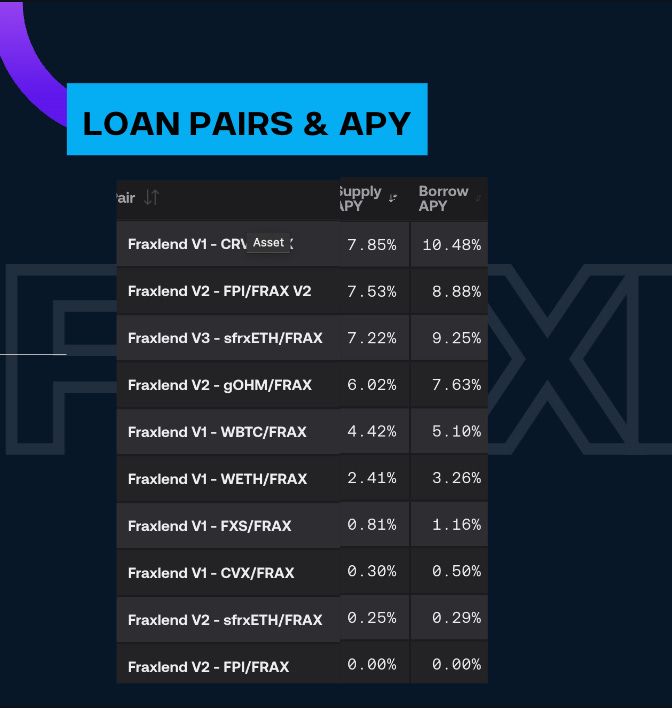 Next we have our FraxLend section.  We’ve snatched a TVL of $242M with $53M in borrowed FRAX.  The charts I like to look at are the Collateral Value and the Supply Value.  These are great proxies for trust in the product.  A good confidence check and you see the graphs are trending up and to the right.  Following that I like to check the utilization %, which for me is how much of the total supply has been borrowed, and we’re at 77% utilization rate across all the lending pairs.  This is a slightly different way of looking at utilization rates, but I prefer it.  Currently, there are many pairs being offered on FraxLend but more and more are being added.  Also take a look at the current Supply APY for CRV/FRAXpair.  A whopping 7.8%.  Be sure to listen to our Governance Roundup to get any alpha on any future pairs.  A little further down the list you see there’s the sfrxETH/FRAX pool with a juicy 7% APY.