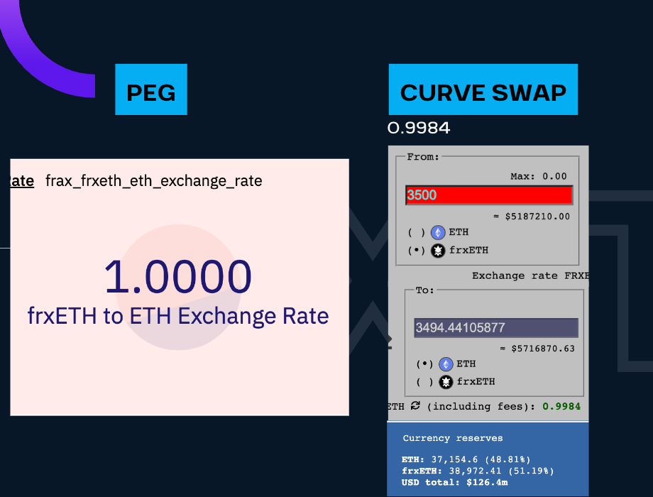 Peg check is as strong as it could be, you see the price delta at 0.0000 between frxETH and ETH.  So parity!  But, we obvs have to go into the market and check this ourselves and you see here that I tried to swap a 3500 frxETH which is roughly the amount of the largest frxETH holder and I get an exchange rate of 0.9984.  And also let’s just note the TVL here, we’re at $126M.  Still 9 SOLID FIGURES baby.  So far so good, let’s see how we stack up with the others.