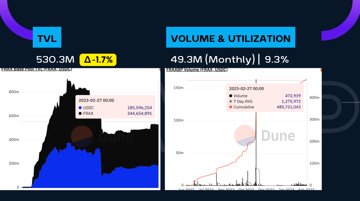 For  this week we saw the FraxBP TVL dropped to $530.3M, which is -1.7% decrease from last week.  On the right side we have a new metric I wanted to start looking at which is the volume traded.  For context, in January we had 12.1M, and in February we hit 49.3M.  Though, this is still only 9.3% of the TVL.
