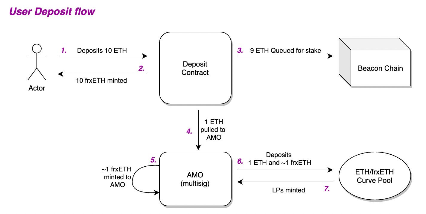 1. For ever 10 ETH deposited by a user, 11 frxETH are minted (10 to user, 1 to AMO)
