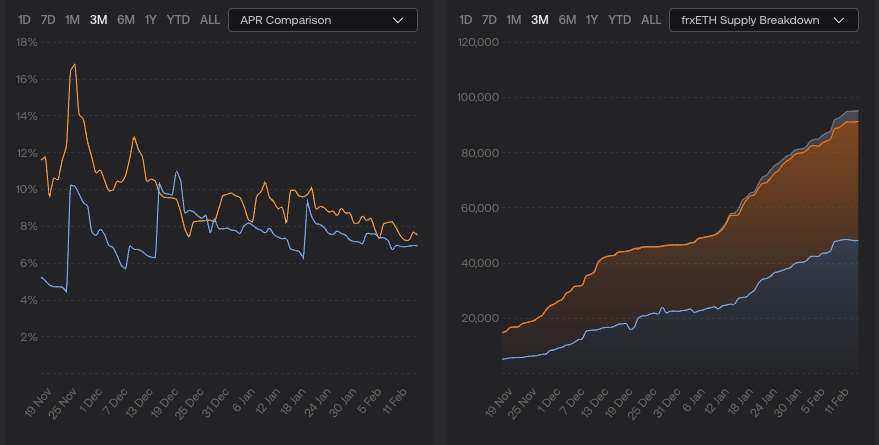 Previous 3 month chart of the Curve frxETH-ETH APR and sfrxETH, frxETH Supply breakdown (Chart legend: Orange line -> Curve frxETH-ETH APR, blue line -> sfrxETH APR) Source