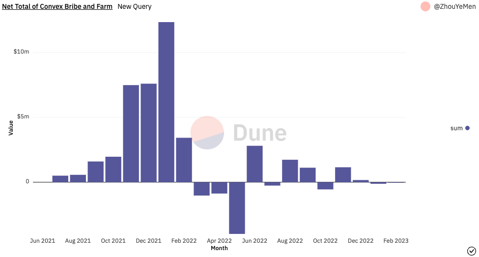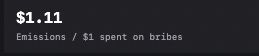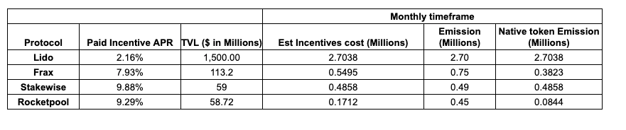 Frax uses $549.5K per month to incentivize the Curve liquidity pool while emitting $750K of rewards, including $382.3K of FXS. While Rocketpool’s native token emissions are slightly more efficient , this is due to Aura’s bootstrapping phase. Frax will soon start to bribe Aura gauges, reducing FXS emissions, as bribing on Aura produces higher rewards currently. Thus, Frax can reduce its Votium bribes as liquidity increases on Balancer (reducing FXS selling pressure).