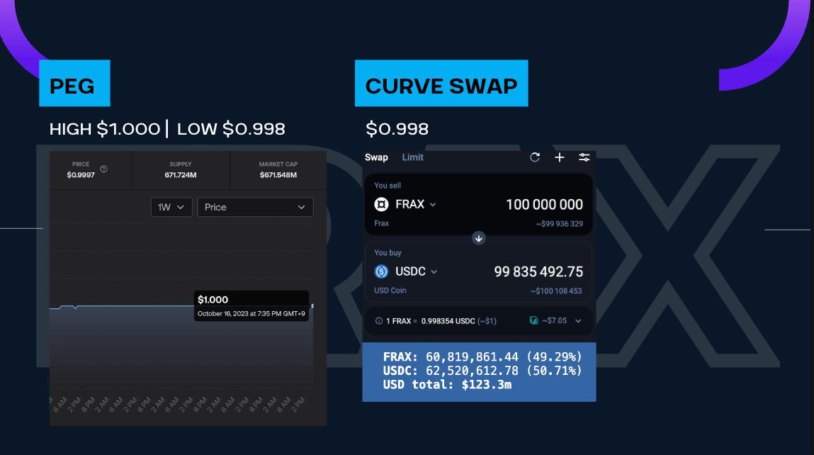 We saw the peg got as high as 1.000 and as low as 0.998. In the market, we saw an exchange rate of $0.998 when swapping 100M FRAX for USDC. We are so back! Last Frax Check we got really close to $0.99.