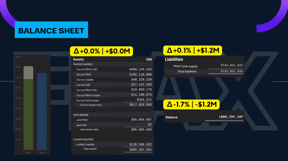 No change on the assets side of the balance sheet for this Frax Check. However, our Liabilities did increase by $1.2M, so our balance equity had to decrease by $1.2M. We currently have $809M in Total Assets, $742.8M in Liabilities, and $66.7M in Balance Equity.