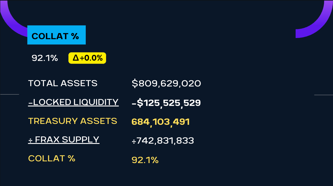 The Collateralization Percentage remained at 92.1%. We got this number by taking the Total Assets ($809M) subtracting the Locked Liquidity ($125M) then dividing that by the Total Frax Supply (742M).