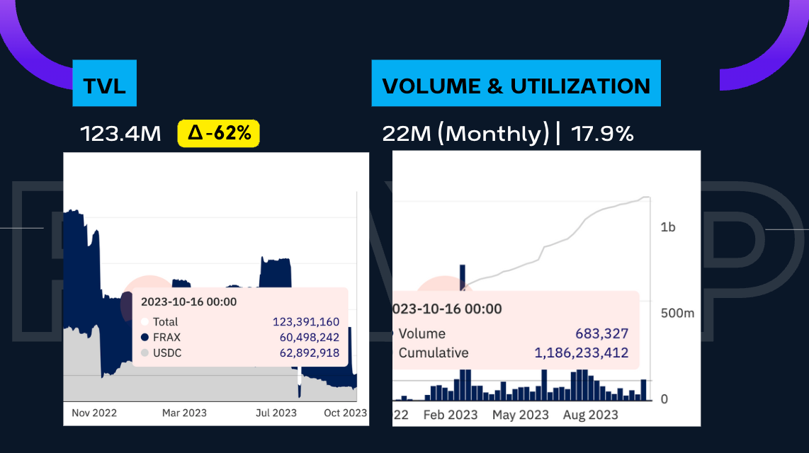 Lastly, we have the final leg of the DeFi Trinity with FraxSwap. We like to call this the Dex that no one talks or knows about. There are only $61.5M TVL across all the pools. We saw decent volume in the FXS/FRAX pair these past 2 weeks with an avg 7D volume of $12M, previously we were in the $3-5M range. For October, this DEX turned over 57% of its TVL.