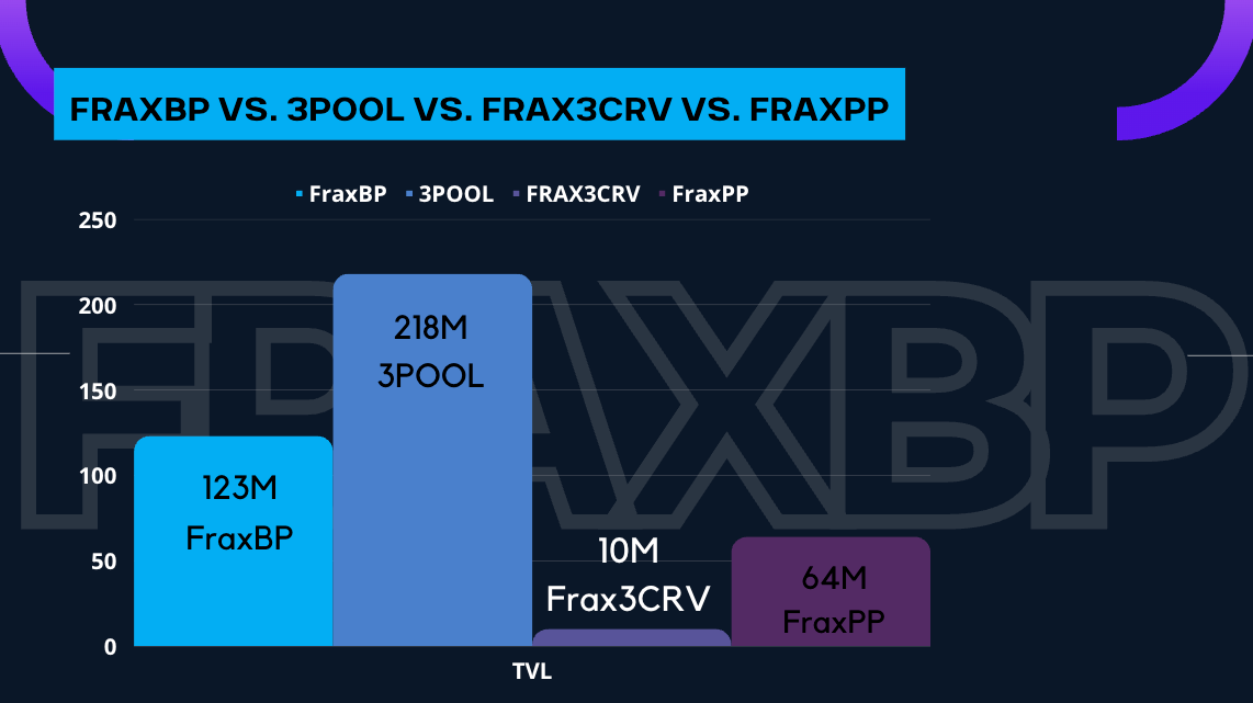 When we add up all the FraxBP, Frax3CRV, and FraxPP, we receive a total of $197M, which is 0.9x of the 3Pool. This is one of the lowest ratios we've seen.