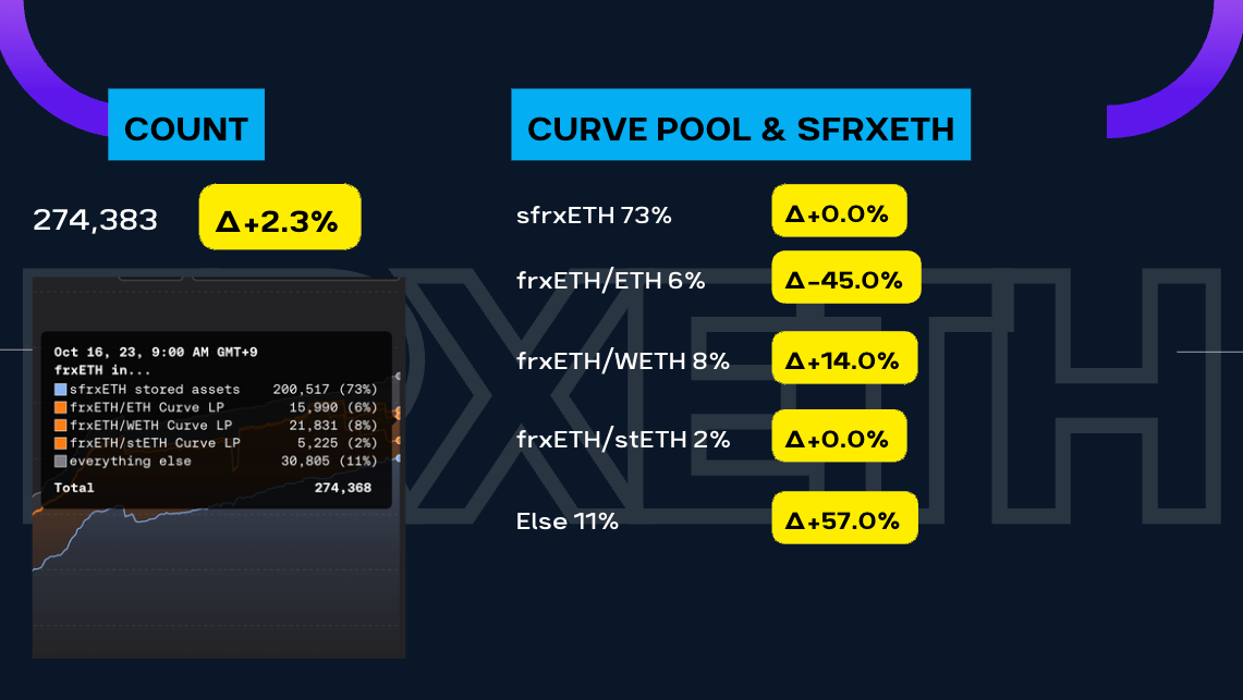 Now onto the crowd favorite, le frxETH. We rocking strong here with 274,383 frxETH supply, a 2.3% increase from two weeks ago. The frxETH/ETH Curve pool dropped by nearly 50%! The liquidity fled to frxETH/WETH and the monetary premium. There's been notable growth in the frxETH/WETH pool which jumped from 7% to 8% of all frxETH supply and the frxETH/stETH pool remained at 2%.