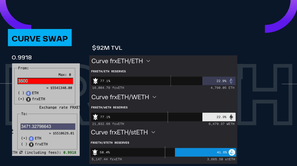 Reminder, frxETH is still a stablecoin, just a stablecoin pegged to ETH instead of the dollar. In the markets, we swapped 3.5k frxETH for ETH via Curve and received an exchange rate of 0.9918. We do not like seeing this exchange rate. We shouldn't have to eat nearly 1% to swap similar assets. We're also seeing similar signals of imbalance in the Curve Pool with a 79/21 split between frxETH and its counter pairs.