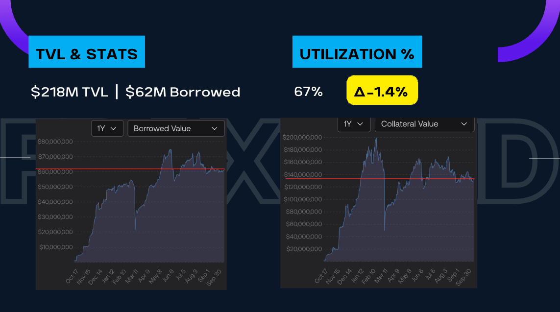 FraxLend's recovery run has stalled a bit since the crazy price action at the end of August and early September. The borrowed value seems to have turned over and heading lower. The collateral value has been steadily rising since the August cleanse. Currently, we have $218M in TVL with a 74% utilization rate.