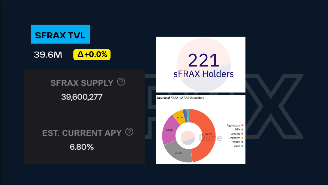 Hey babe wake up. sFRAX is live! No more waiting. Come get real-world yields via sFRAX now. Within 24 hours, sFRAX grew to $30M+ in TVL. The APY at the time of writing is 6.8%. There are 221 sFRAX holders and what's good to see is that folks are actually buying FRAX to stake it into sFRAX. Though 20% came from lending protocols so be careful with leverage y'all!