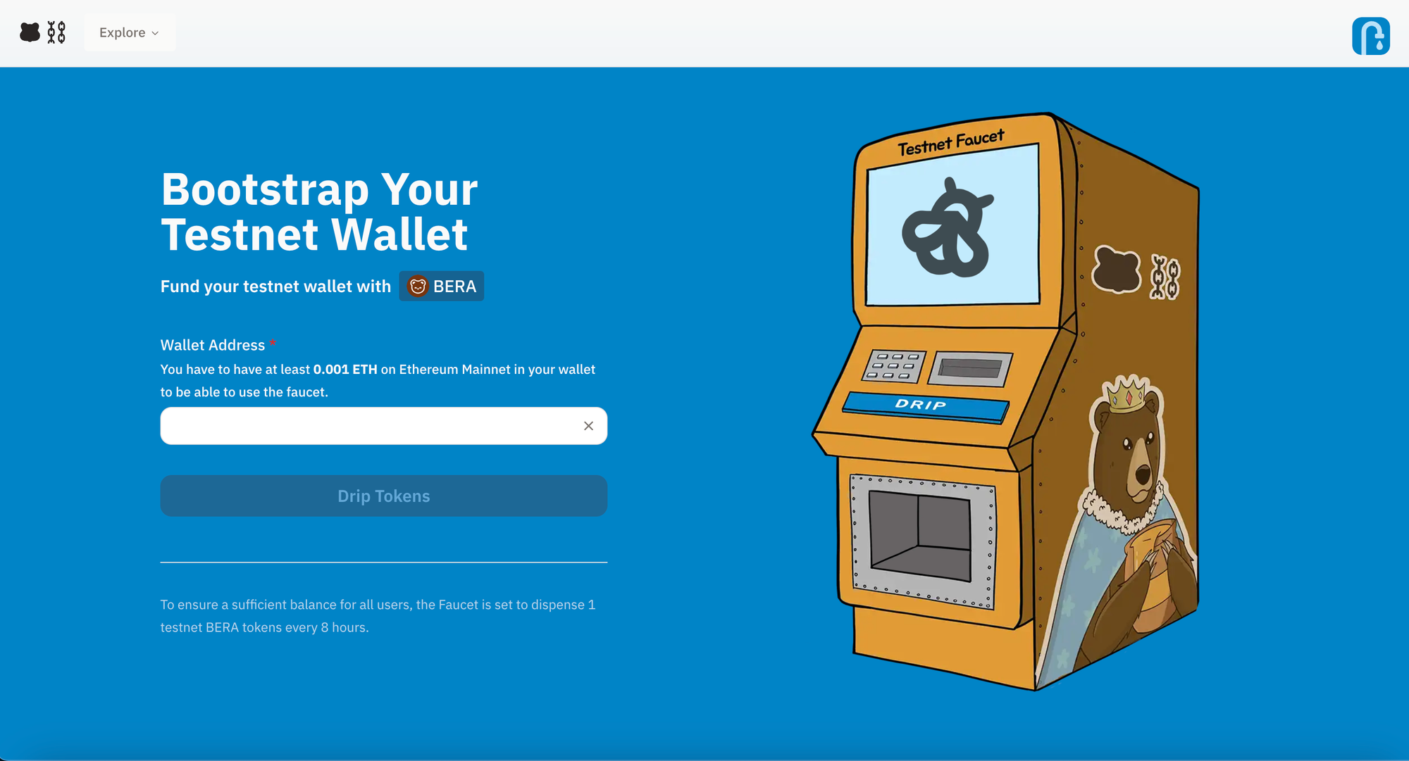Once you're reached their official faucet, you will need to have a minimum of 0.001 ETH on Ethereum Mainnet in your wallet. Once that once condition is met, you can copy your wallet address and paste it into the box and you will receive 1 $BERA.
