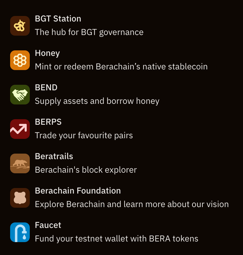 Now once you've gotten some testnet $BERA its time to play around in the ecosystem. You can start by trying out their native Dapps as shown in the image in step 1. If you are more adventurous then below is a fair list of projects for you to check out and learn about the ways of the bera.