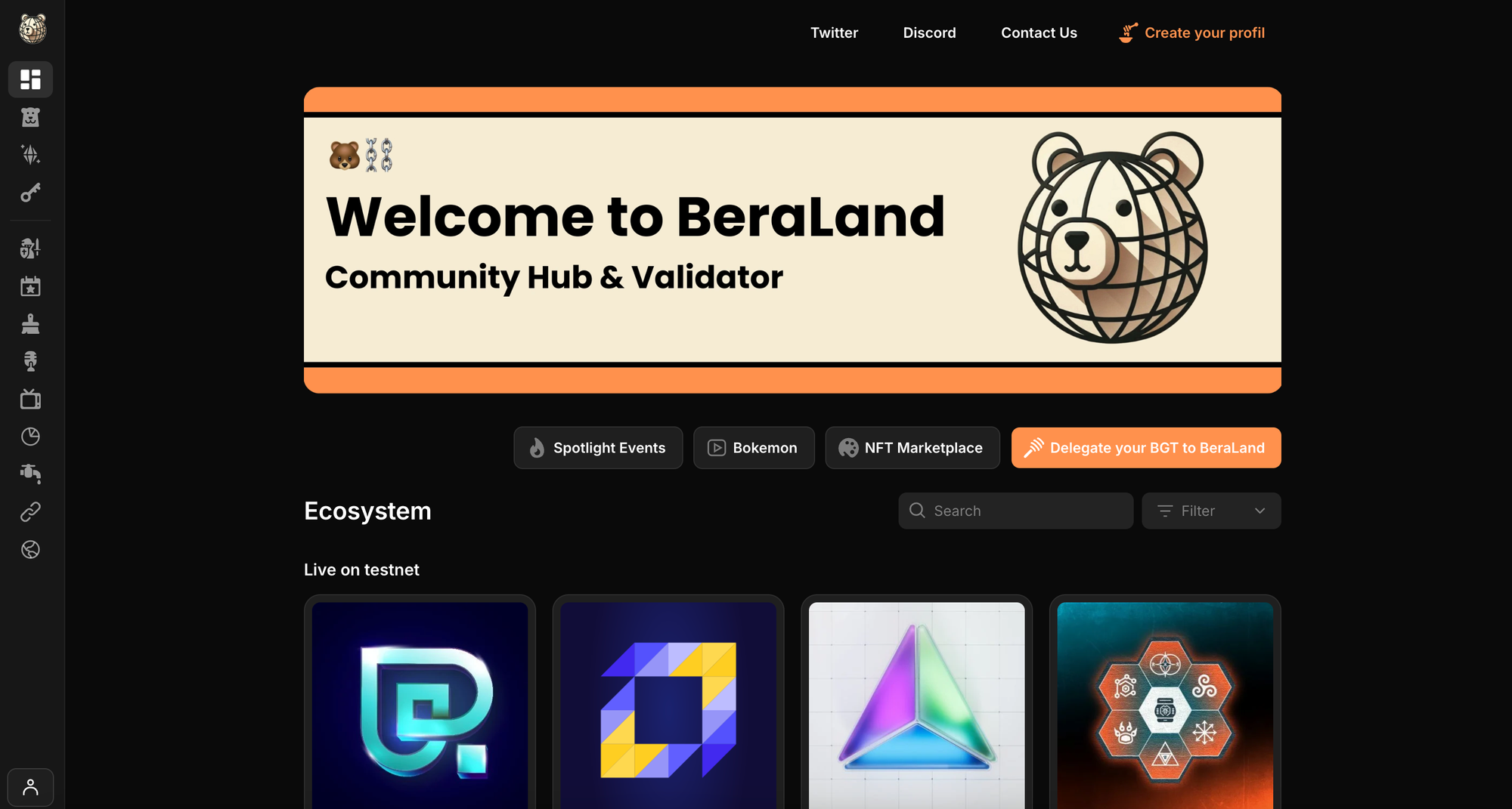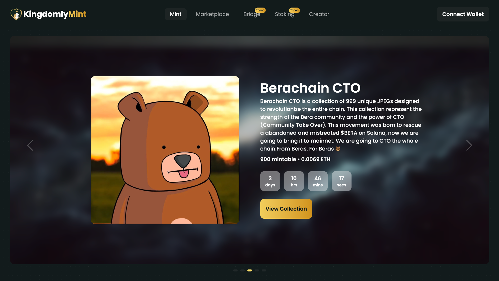 Kingdomly is an NFT marketplace and launchpad live on Berachain testnet as well as Arbitrum. Users can create NFT collections at ease using their Creator product as well as purchase/mint a wide variety of Berachain native NFTs. Although a good majority of project NFTs were launched on Arbitrum pre-mainnet and will eventually be able to be bridged. Furthermore, the project will thoon be annoucing their bridge and staking features which can be expected to come when mainnet launches.