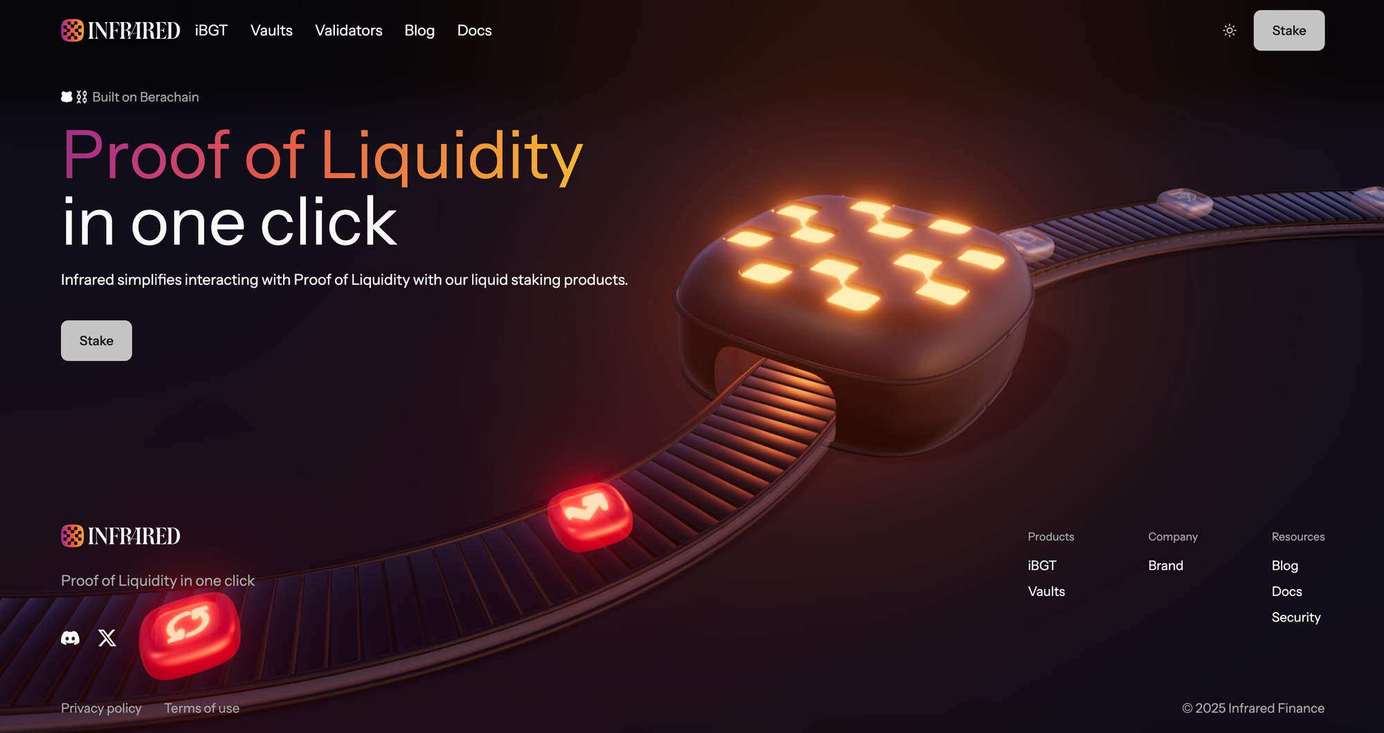 Infrared is the gateway for users to seamlessly engage with Berachain's Proof-of-Liquidity in just one click. The protocol provides simple liquid staking solutions for $BGT and $BERA, vaults, as well as node infrastructure. Users can stake their $BGT for $iBGT and earn 0.61%, contribute their BGT to their validator for 18.51% or deposit their tokens in their vaults to earn up to 611% APR.
