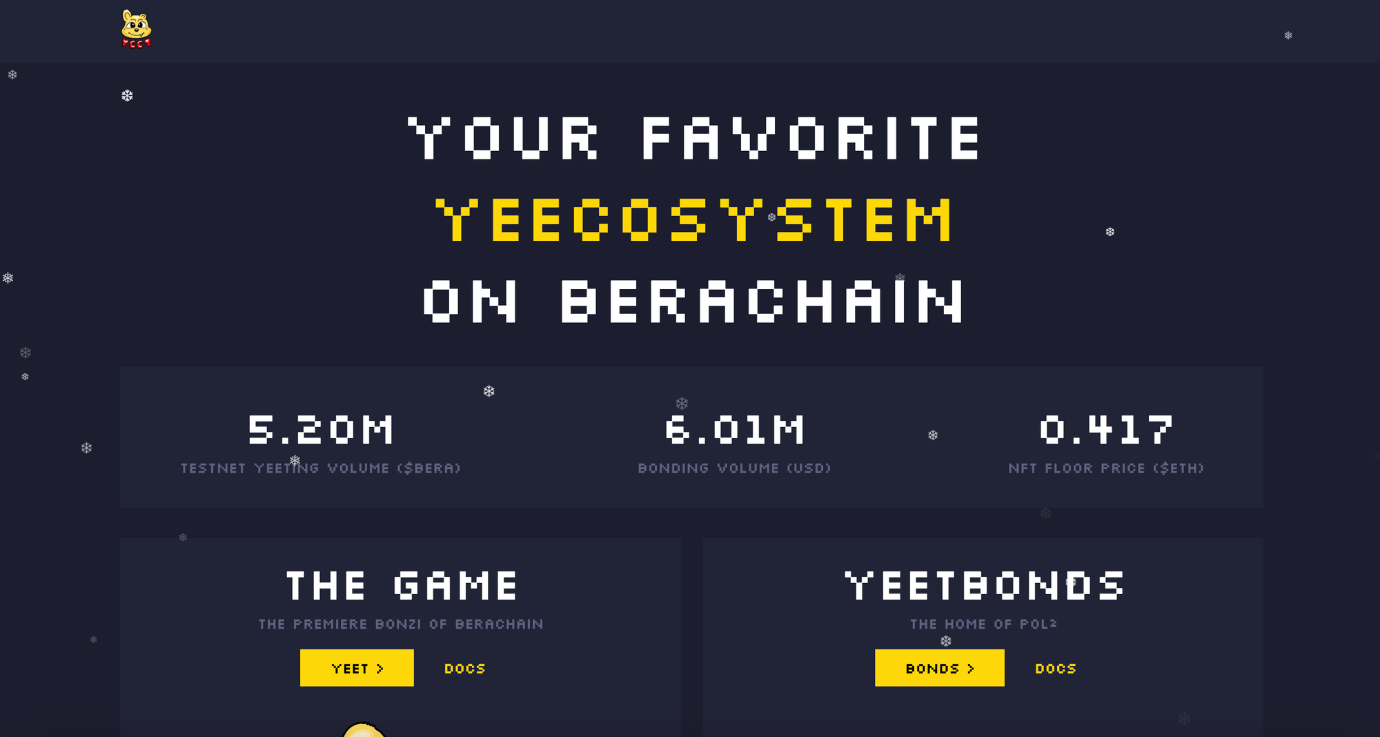 Yeet is the perfect place if you want to have some fun when engaging in DeFi. Users can Yeet their BERA in their premiere bonzi game to either lose it all or win the prize pool. Users are also able to stake their $YEET to earn 8.2% APY in addition to their YeetBonds product which offers a wide variety of options. Their official ICO will take place on Berachain day 1 so be prepared. Overall beyond users burning their Yeetard NFTs for absolutely zero benefit, this is a great place to yeet some $BERA. P.s. Be sure to check out their docs ;)