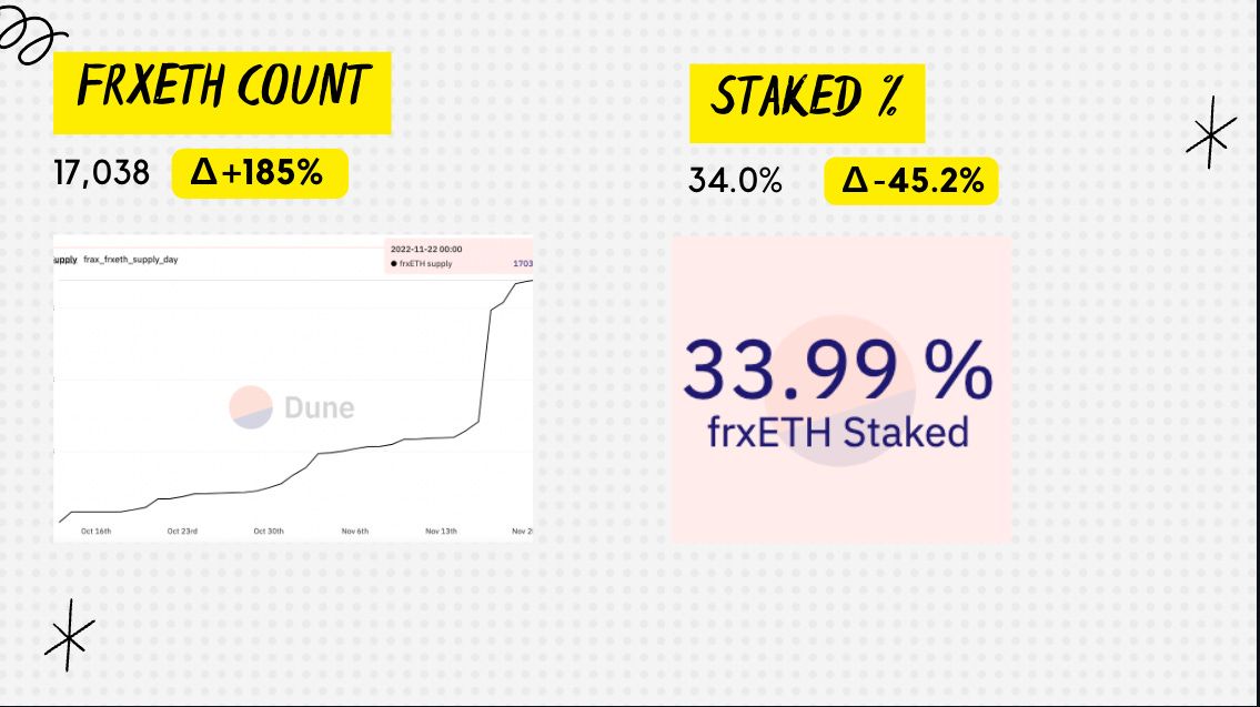 The count is at 17,038.  And look at that chart, I know you can’t read it but just appreciate the verticalness off that graph.  +185%.  Hot.  On the staked side we see that 34% of all the frxETH is being staked to earn the ETH native staking rewards, which is 5-7% but since only a third of frxETH is staked we can multiply that 5-7% by 3x.  Let’s do a quick summary check.