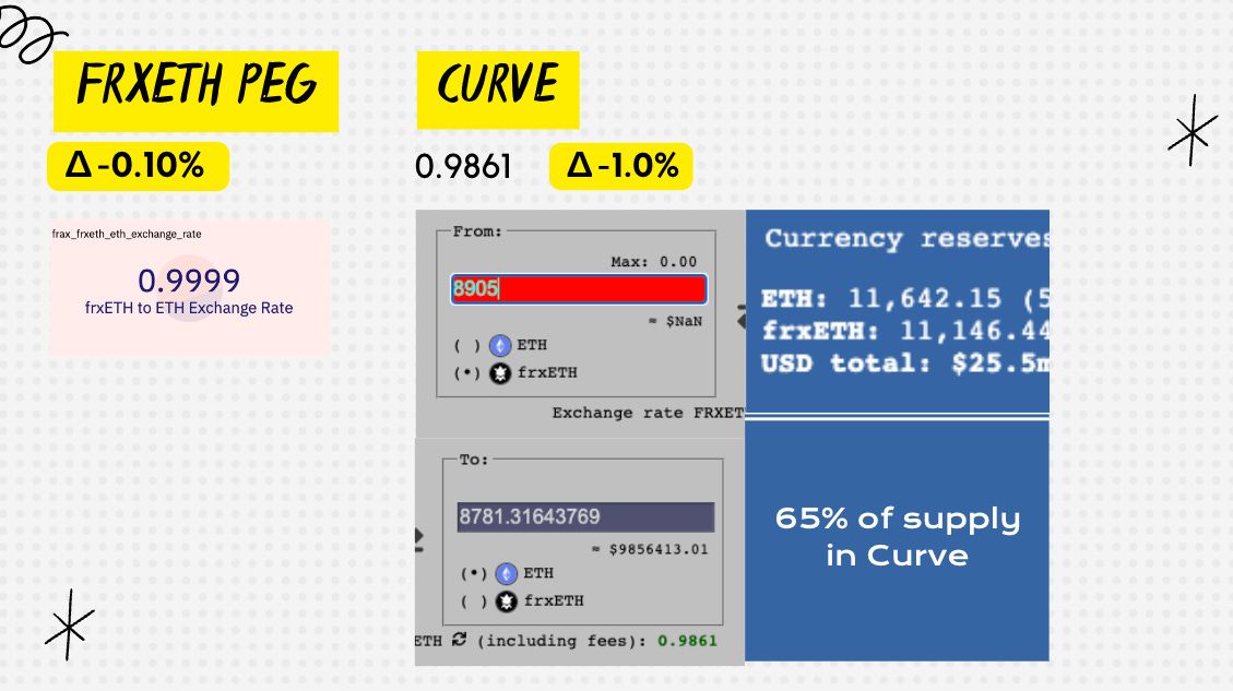 Next, we have our new segment of the check where we look at FrxETH.  As always, we check the peg.  Peg check here is strong you see the price delta is only 0.0001 between frxETH and ETH.  We obvs have to go into the market and check this ourselves and you see here that I tried to do a 8905 ETH swap which is about $10M and I get an exchange rate of 0.9861.  That’s kinda ish good.  Also, last week we had 38% of the frxETH staked in the Curve pool, and now we have 65% of the supply inside curve.  The APY as per Convex is at 10% projected.  Littttt.  That’s why everyone is here.  Let’s see what the count looks like this week.
