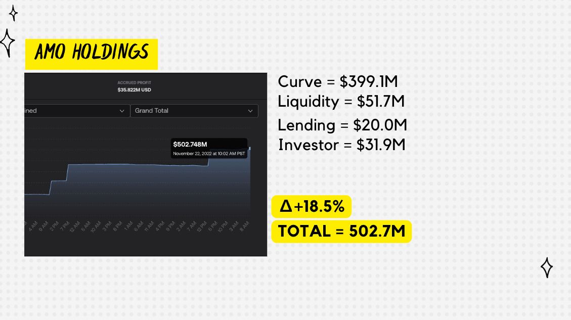 Onto the profitability of the Curve AMO.  We’re now at $1.151M in Revenue for the month of November.  We paid roughly $1.28M in bribes so far plus about $430k in expenses, our loss is at $200k right now.  There’s some oddities going on cuz the Nov 14th bribe expense isn’t pulling in properly so I need to do a check at month end for proper accounting but I expect this to be our first down month.  RIP November.
