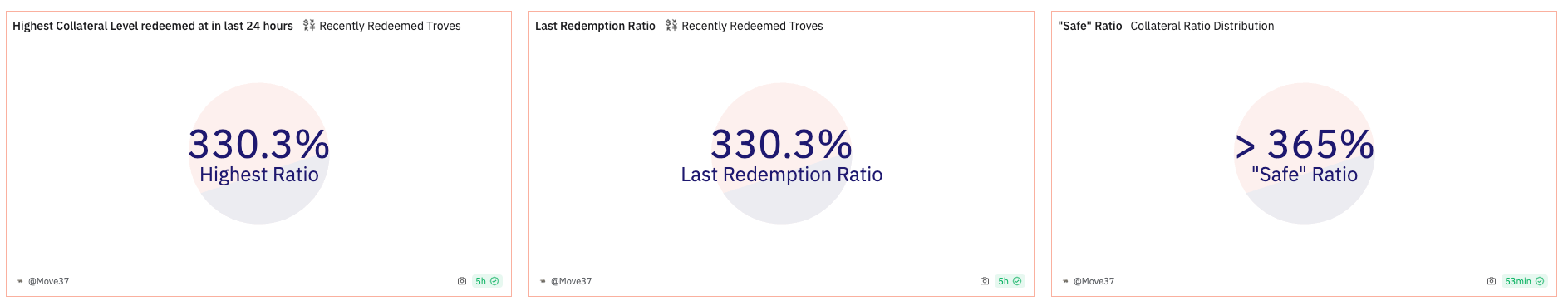 When the LUSD is redeemed, the Troves with the lowest collateralization ratio are redeemed. Liquidation for Troves occurs at 110%, and the minimum CR for Trove creation is 150%. But right now the "safe" CR for Liquity Troves is 365%!
