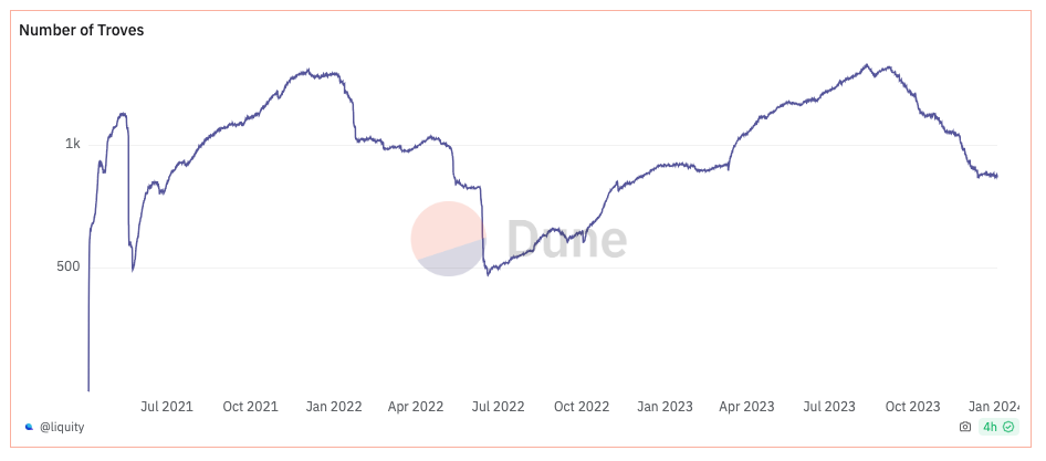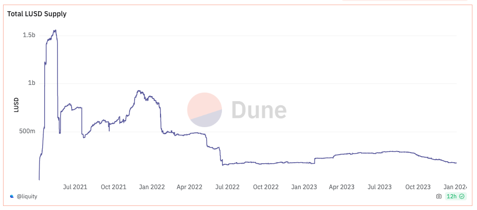 And so as a result of the ever higher pushing CR and decreasing capital efficiency of LUSD loans, the total supply of Liquity's stablecoin has been decreasing for several months.