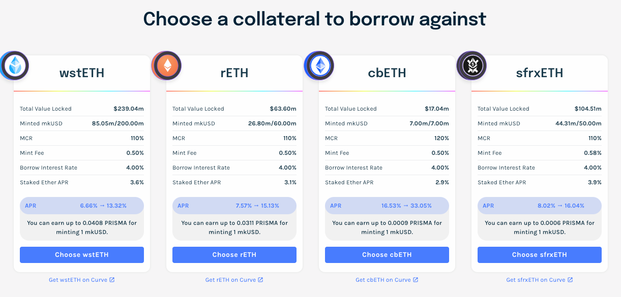 Post-Shapella demand LSDs skyrocketed and the yield bearing assets are now the preferred collateral for DeFi. Liquity's non-usage of LSD as collateral is due to the protocol being deployed pre-Merge. Prisma allows any of these 4 assets to mint their stablecoin mkUSD.
