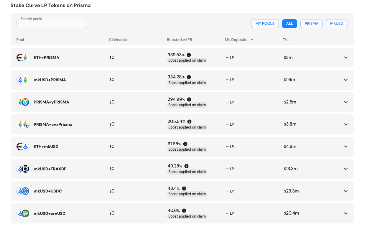 Convex enables boosted yield farming of Prisma's LP pools. The FRAX/mkUSD pool currently has $13.3m TVL and is earning 49% boosted APR.