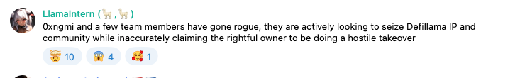 The community started a discussion in LobsterDAO, asking first in 0xngmi’s account had been hacked to which he said “not compomised” and offered to verify with his wallet signature. A few minutes later, LlamaIntern, who runs the DeFiLlama roundup told the chat that 0xngmi had gone “rogue” and he was “actively looking to seize DeFiLlama IP and community.