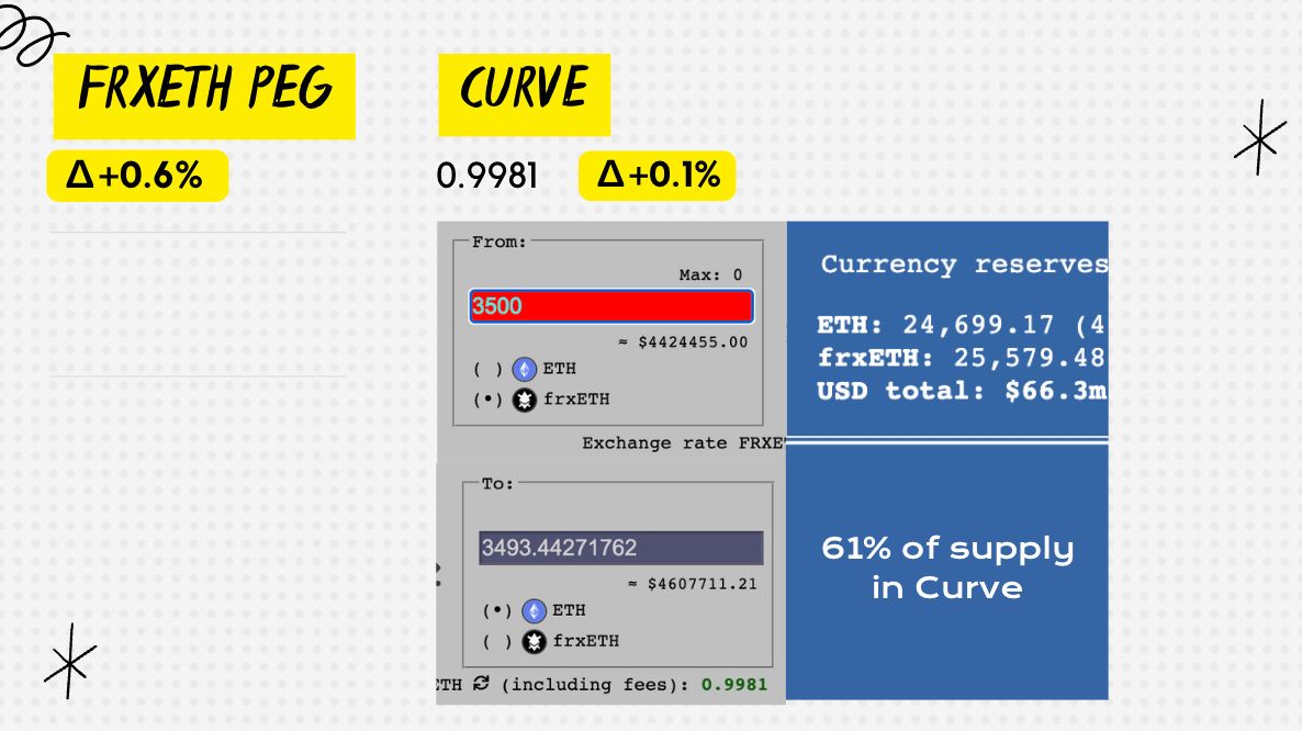 Next, we have our new segment of the check where we look at FrxETH.  As always, we check the peg.  Peg check here is strong you see the price delta is only 0.0007 between frxETH and ETH.  We obvs have to go into the market and check this ourselves and you see here that I tried to do a 3500 ETH swap which is roughly the amount of the largest frxETH holder and I get an exchange rate of 0.9981.  That’s not too bad.  Also, last week we had 61% of the frxETH staked in the Curve pool, and now we STILL have 61% of the supply inside curve.  The APY as per Convex is at 11% projected.  Littttt.  That’s why everyone is here.  Let’s see what the count looks like this week.