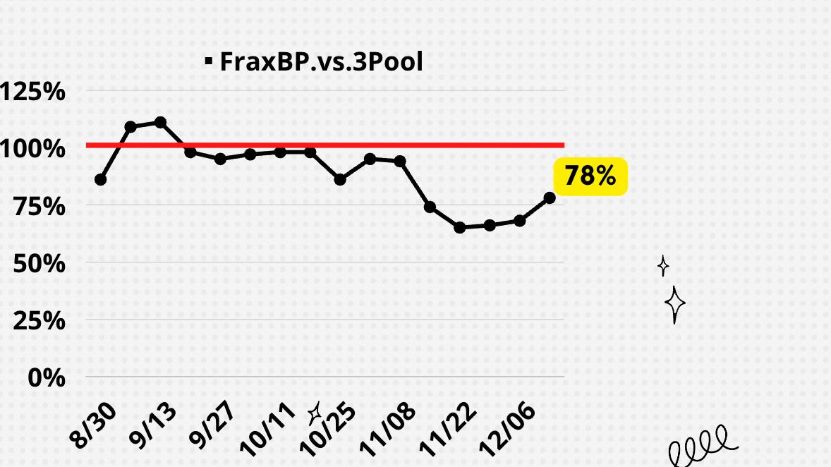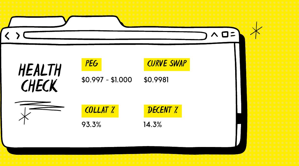 Okay.  Quick summary Health Check.  Peg Good.  Curve Swap much better this week.  Collat % could be better.  Decent % bounce from ATL and now ranging.