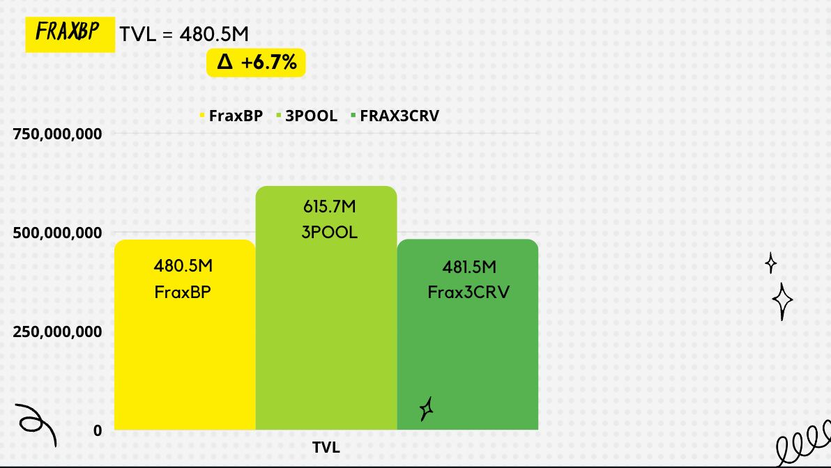 Here's my favorite section of the Frax Check.  The Liquidity Check.  Do you guys remember the theme of this week, it was “Just Keep Swimming”. And you know how we’ve just literally been ranging these past few weeks.  (Dave gets excited) SOMETIMES WHEN YOU KEEP SWIMMING AND KEEP PERSERVERING, YOU WIN.  We’re at 78% of the 3POOL.  Let’s GO.  WE AIN’T RANGING IN NO MO’.  WE TRENDING UP BABY.  The FraxBasedPool is $480.5M versus 3pool's $615M.  The basedpool saw an increase of nearly 7% in TVL, that’s like $30M baby.  But Note that we’re NECK-to-NECK with Frax3CRV pool again.  Let’s first flip this then we set our eyes on the 3pool.  Moving on, let’s chat about our metapools.