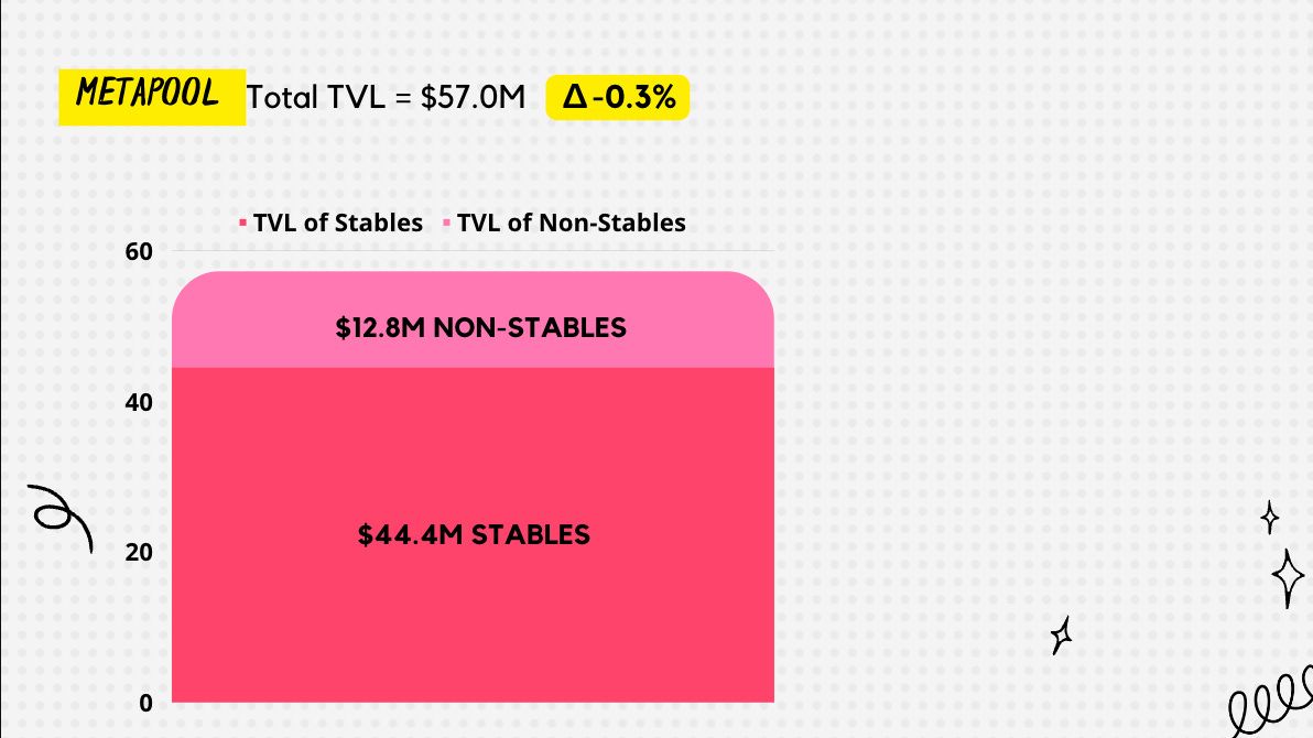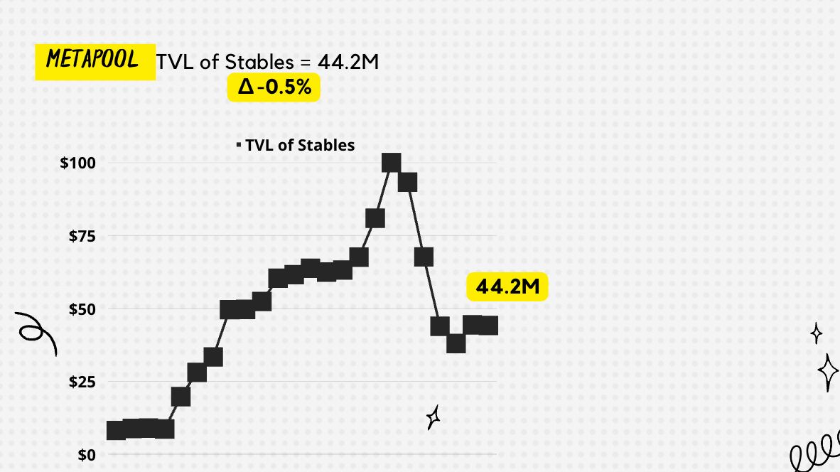 Reminder the metapool are pools that are PAIRED with the BasedPool, examples like LUSD/FraxBP.  We’re ranging again now at $44.2M versus $44.4M last week.  Pretty much unchanged.  We did get as low as $38M 2 weeks ago so I’m glad to see this relief bounce. Any projects out there looking to work with the Metapool, please join the Flywheel pod TG chat and DM any of the hosts for assistance.