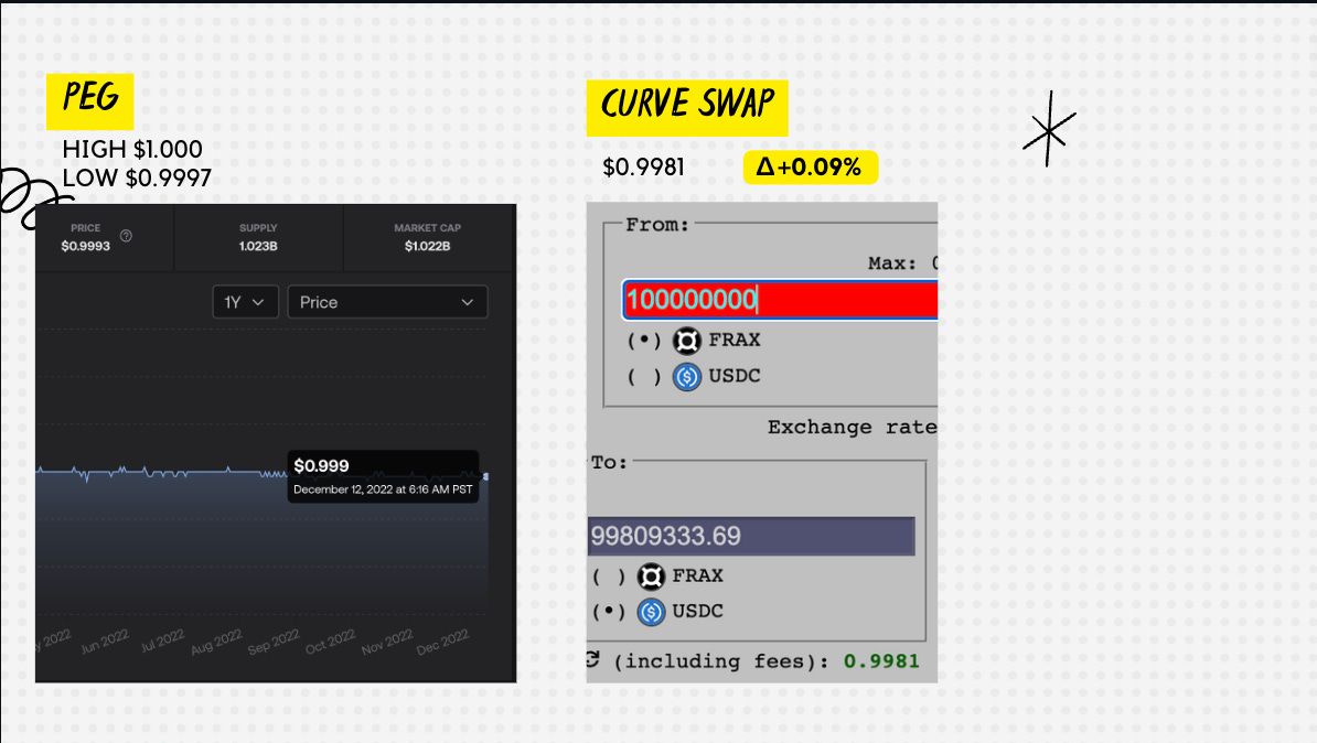 Let's begin our regular programming with the Peg.  We saw it get as low as $0.997 with a high of $1.000 for the week.  Peg Check = Strong.   We then looked at Curve via swapping 100M FRAX for USDC.  We received a 0.9981 exchange rate, which is an increase of 9 bps compared to last week’s.  Moving on we have our Collateralization %.