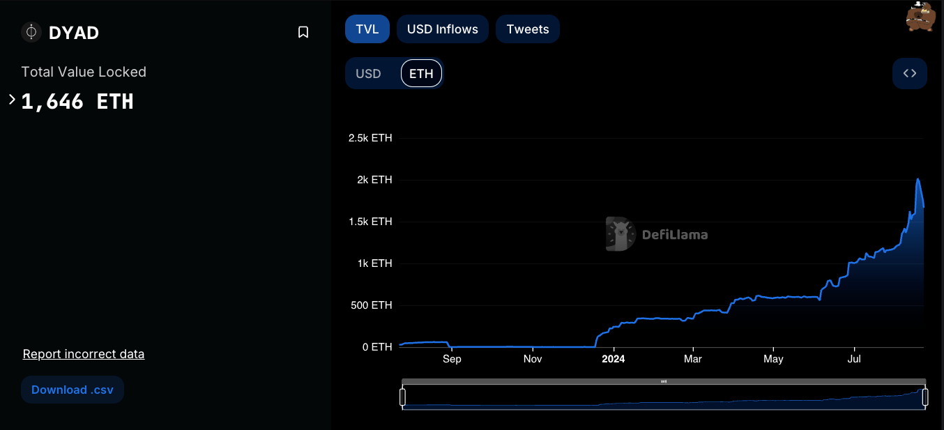 We're just at the beginning too. Dyad was launched just a few months ago and it's slowly been capturing TVL. It recently crossed 2k ETH ($5m) total deposits a week ago.