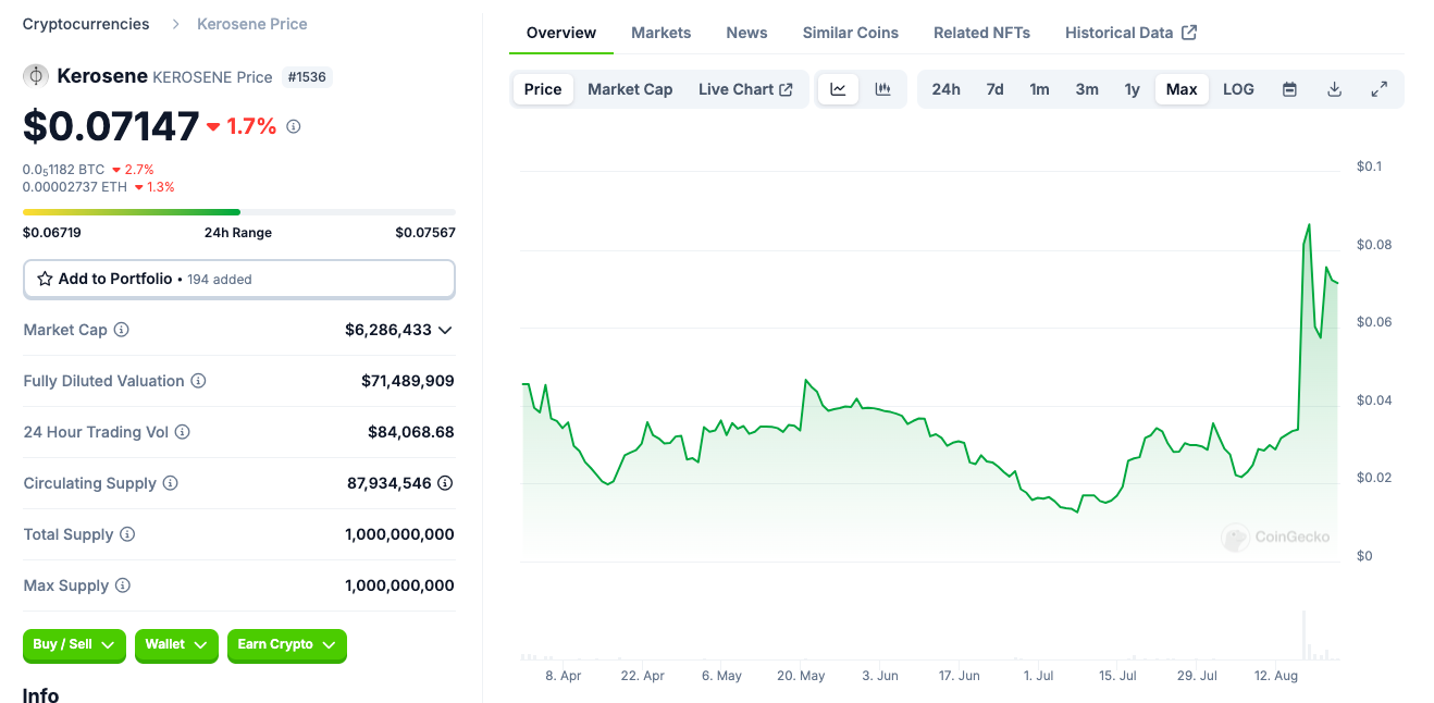 Kerosene is also seeing some growth, with prices tripling in the last two weeks, to .07, giving the project an FDV of $71m.