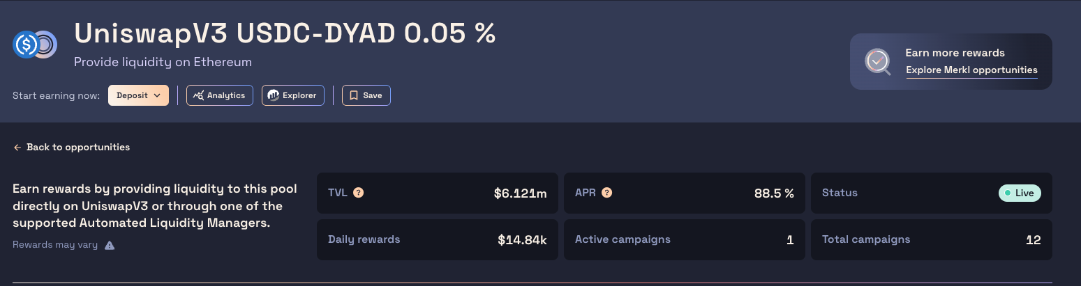 Circulating supply is less than 10% right now, and yields are above 80% on Merkle for the DYAD/USDC LP.