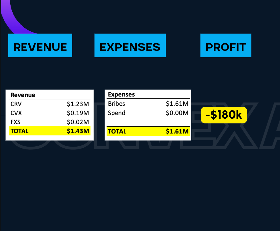 Onto the profitability of the Convex AMO.  For the month of March, we have $1.43M in revenue and $1.6M in bribe expense, which means we are at a loss of $180k for March.  The lionshare of the revenue came from CRV at $1.23M, that’s 86% of the Convex AMO revenue.  We believe we may end the month very close to being flat!  Will report back next week with the final count.