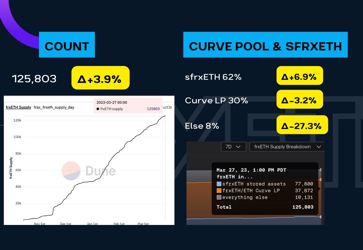 Next, we have our FrxETH segment.  We start by checking the frxETH supply.  As always, it’s up only!  The count is at 125,803, +3.9% WoW -- not terrible but we prefer a 5% WoW.  Let’s look at where the frxETHs are hanging out!  As a reminder, frxETH could be staked into the sfrxETH vault to earn the native ETH staking yield – which is printing a nice 6.4%.  And in that vault we see that 62% of the frxETH is chilling and stacking ETH earning a nice native staking yield.  The other place frxETH can be put to work is in the curve pool of frxETH/ETH, where 30% of the frxETH supply is currently at.  The remainder 8% is floating in the ether somewhere. We think the yield parity between the sfrxETH and Curve pool is reflected in the current split.  Unless Frax cranks up the bribes a bit more, we think we’ll see this heavier flow into sfrxETH.  But enough talk of the supply and the yield, let’s get down to the peg.