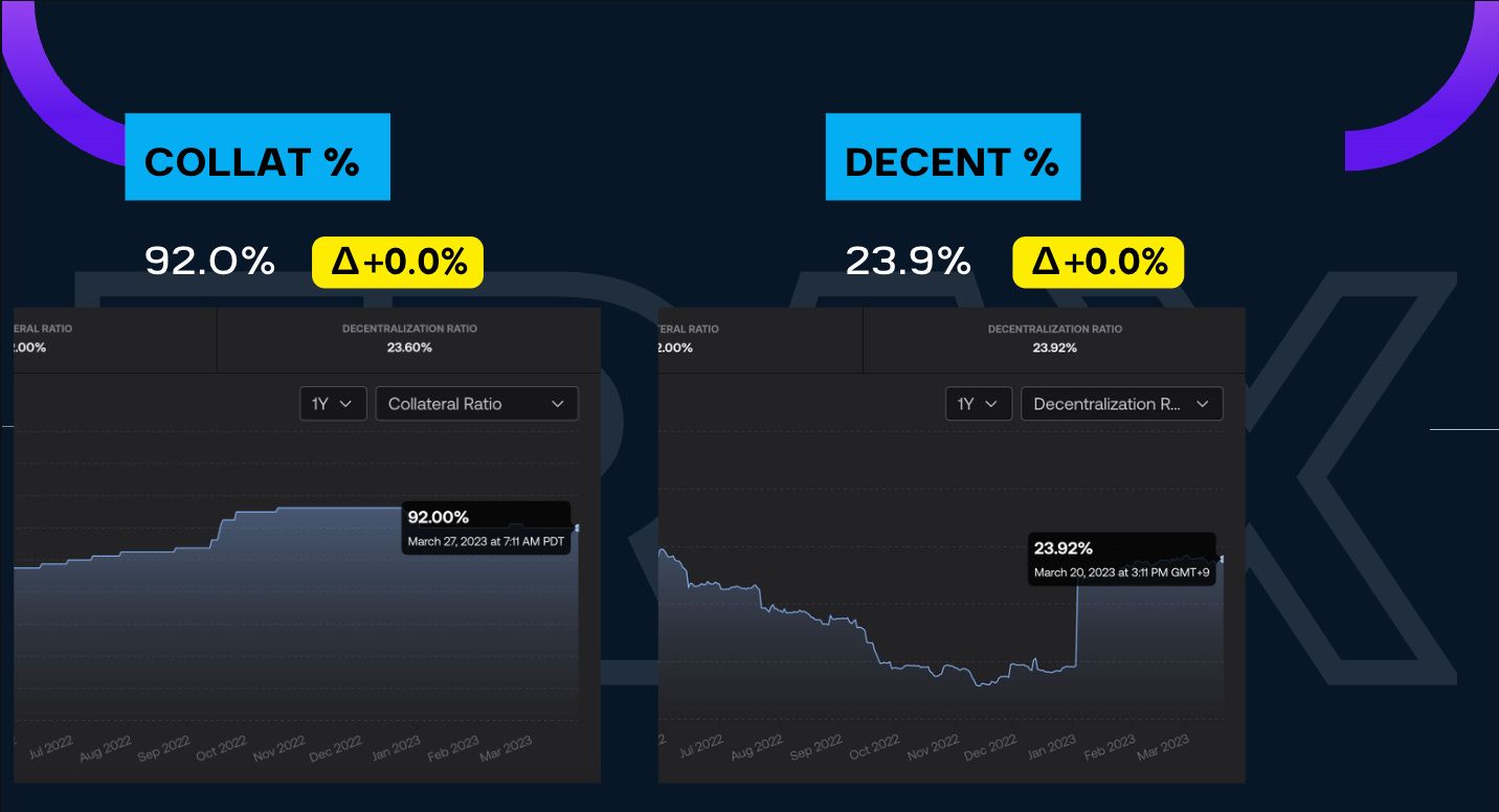 The Collateralization percent conveys how much FXS (algorithmic) is used as collateral.  We’re unchanged at 92%.  Following we have the Decentralize percent, which is also unchanged and are now sitting at 23.9%.