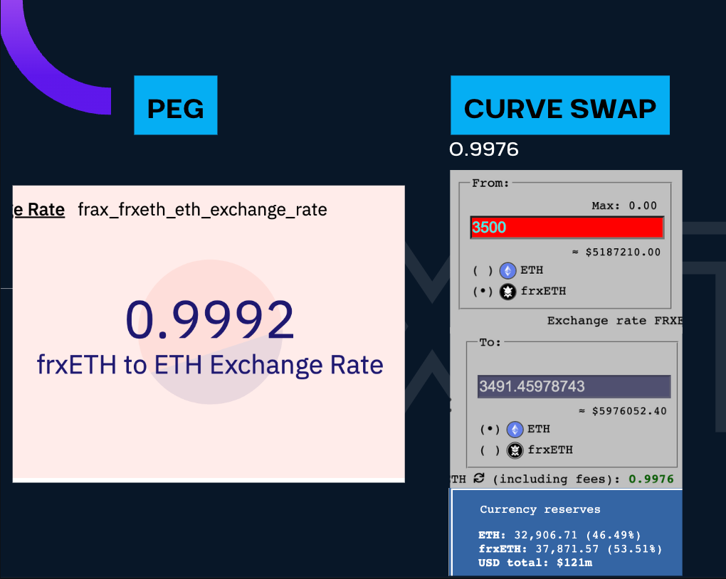 Peg check is at a solid 0.9992.  Let’s check the market.  We tried to swap a 3500 frxETH which is roughly the amount of the largest frxETH holder and we get an exchange rate of 0.9976.  Not too bad considering we got as low as 0.9950 two weeks ago.  But we still don’t like to see a number 7 there, these are similar assets so the exchange rate should remain above 0.998.  Fortunately, the TVL is quite sticky at $121M, still 9 SOLID FIGURES.  So far so good, let’s see how we stack up with the other competitors.