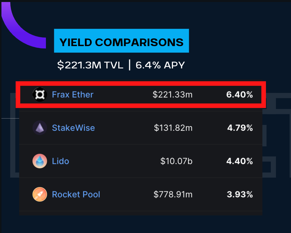 Here we layout the LSD market landscape.  We have Lido in the lead with 74.5% of the market.  Though, Frax REMAINED the highest 30-day delta in the group, at +22.2%.  FrxETH’s market share is at 1.6%, gained 0.05% over the last week!.  Let’s keep fighting the good fight!  On the yield landscape, frxETH pretty much dominates with 6.4% and the closest competitor is Stakewise with 4.8%.