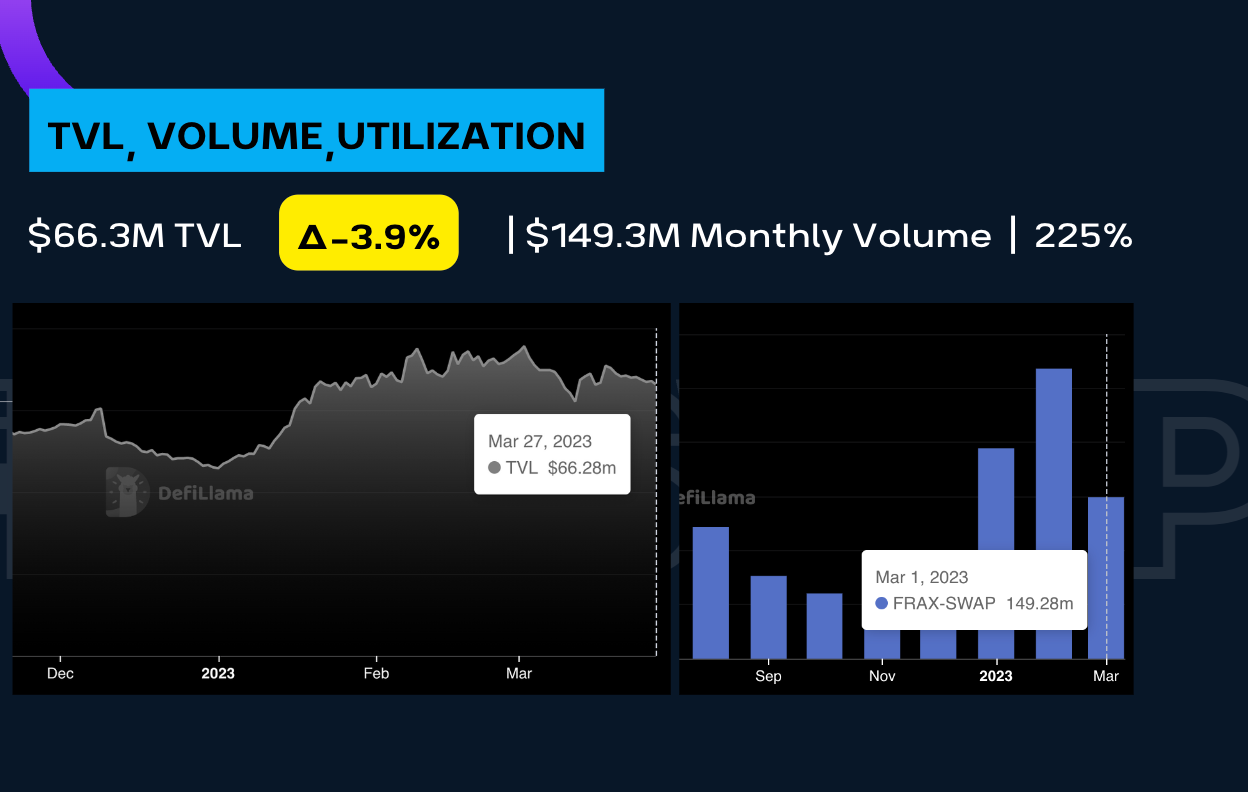 The last leg of the Stablecoin Maximalism, the DEX aka FraxSwap.  Per DeFi Llama, the TVL is $66M with a 149M monthly volume for March. We took the Monthly volume divided by the TVL to get a utilization rate of 225% — pretty well utilized for a DEX no one knows about.